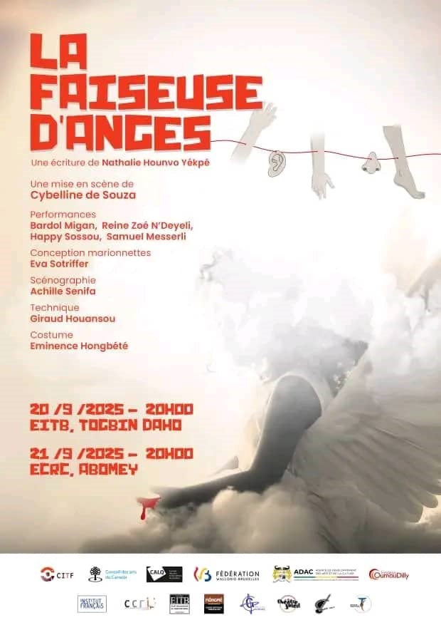 L’Ecole internationale de théâtre du Bénin (Eitb), dirigée par Alougbine Dine, a accueilli, samedi 20 septembre 2025, la représentation théâtrale intitulée  » La faiseuse d’Anges », un texte de la dramaturge Béninoise Nathalie Hounvo Yèkpè mis en scène par la comédienne menteuse en scène Cybeline de Souza.