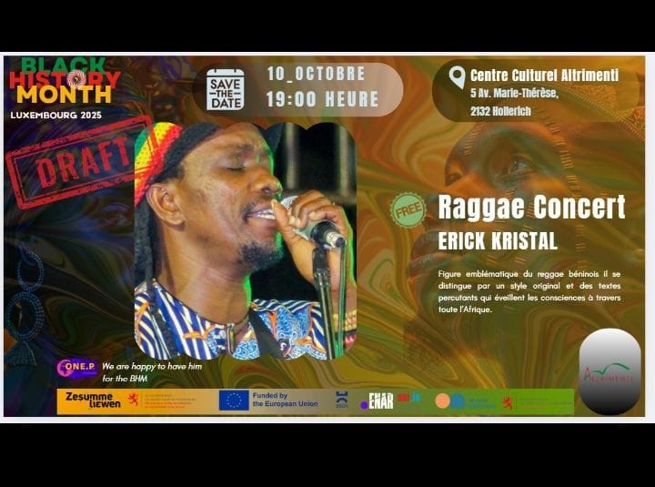 Le Reggae man béninois Erick Khristal s’active pour donner un mémorable spectacle à Luxembourg. Le Reggae made in Benin va vibrer au Luxembourg, le 10 Octobre 2025 à 19h au Centre Culturel Altrimenti 5Av. marie-Thérese, 2132l Hollerich et le 11 Octobre 2025 au centre de Luxembourg.