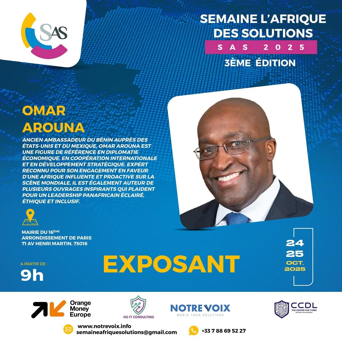 Les 24 et 25 octobre 2025, la capitale française accueillera la troisième édition de la Semaine l’Afrique des Solutions (SAS), un événement international majeur dédié à la valorisation des innovations et des initiatives à impact positif issues du continent africain. Parmi les figures de proue attendues cette année figure Omar Arouna, ancien ambassadeur du Bénin aux États-Unis et au Mexique, stratège d’influence et auteur engagé.