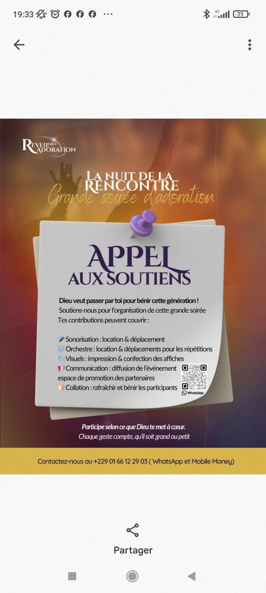 Pour cette première édition, les organisateurs lancent un appel aux bonnes volontés pour accompagner cette convocation solennelle qui débouchera, à coup sûr sur un Réveil spirituel au Bénin. « La Nuit de la Rencontre, c’est plus qu’un événement : c’est une expérience de transformation et de communion avec Dieu », conclut Yédiya Allotchemey. Contact Appel & WhatsApp : +229 01 66 12 29 03.