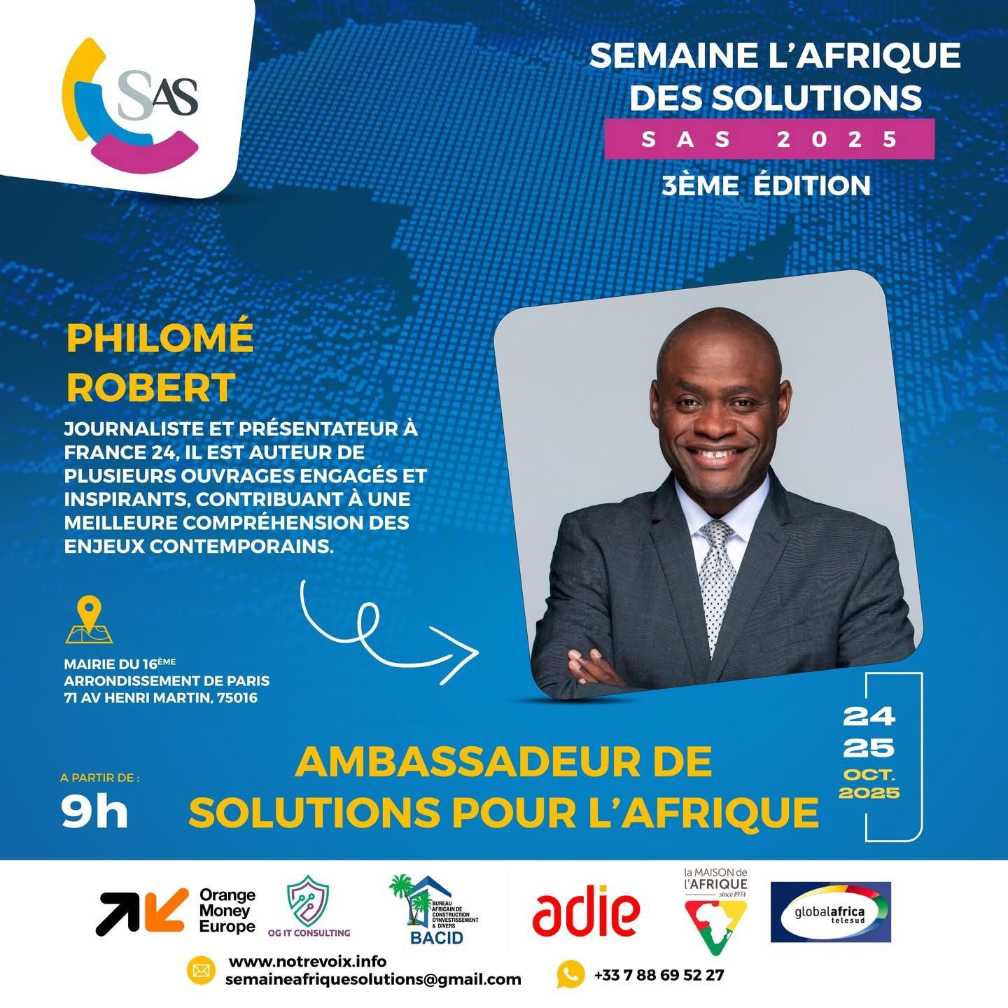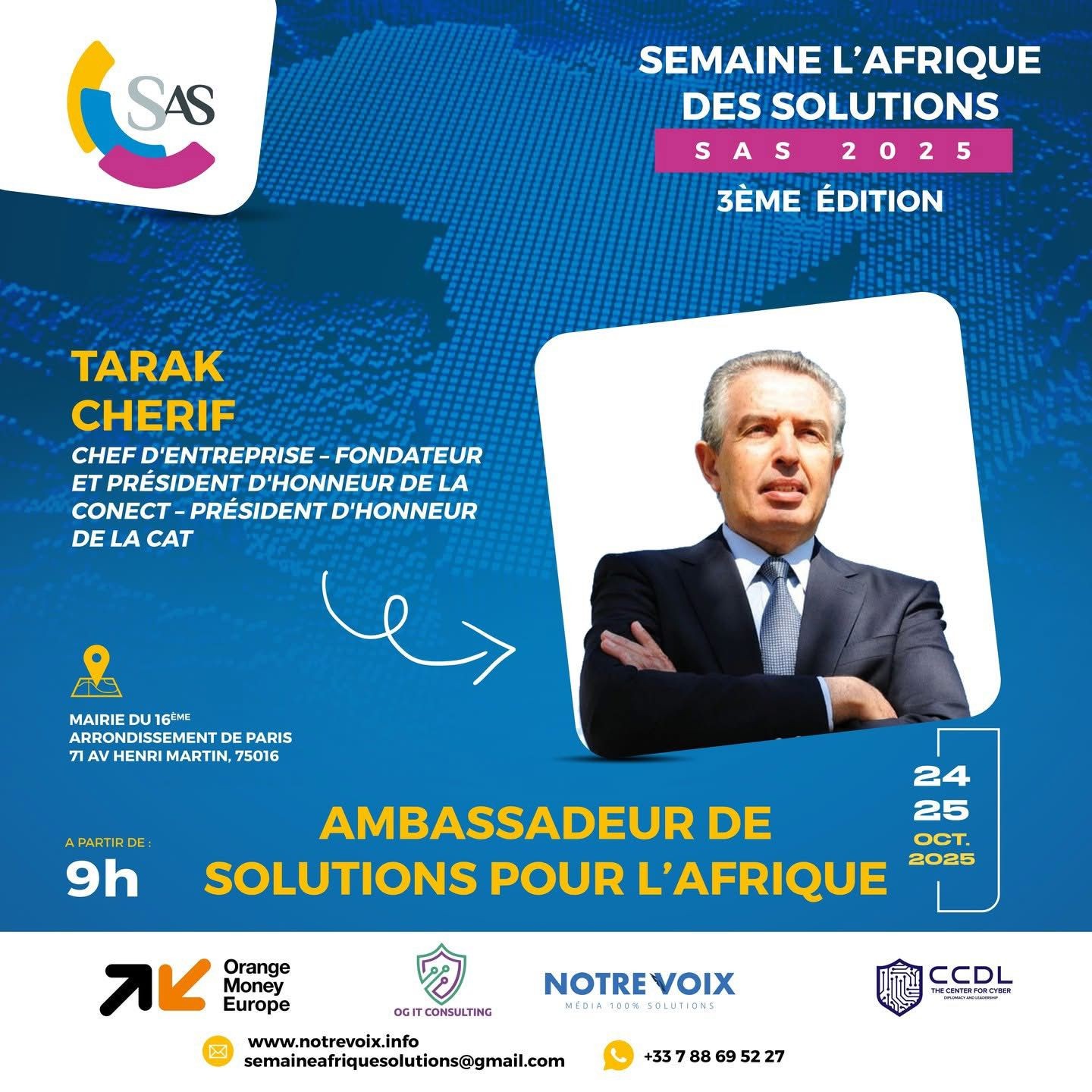 À l’occasion de la 3ᵉ édition de la Semaine l’Afrique des Solutions (SAS), deux figures majeures seront célébrées : Tarak Chérif, entrepreneur et bâtisseur de ponts économiques, et Philomé Robert, journaliste et écrivain engagé. Ce rendez-vous unique, qui se tiendra à la Mairie du 16ᵉ arrondissement de Paris, réunira pendant deux jours des porteurs de solutions venus d’Afrique et d’ailleurs, sous le thème : « S’unir pour bâtir l’Afrique des solutions ». Une rencontre 100% solutions, pensée pour valoriser l’innovation, l’inspiration et l’impact.