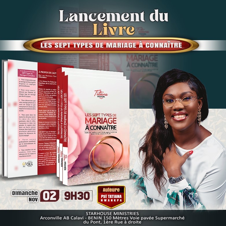 L’écrivaine et Pasteure béninoise Tatiana Nwankpa s’apprête à lancer son nouvel ouvrage, «Les sept types de mariage à connaître». Un événement très attendu et prévu pour dimanche 02 novembre 2025 à Abomey-Calavi dans l’auditorium de Starhouse Ministries.