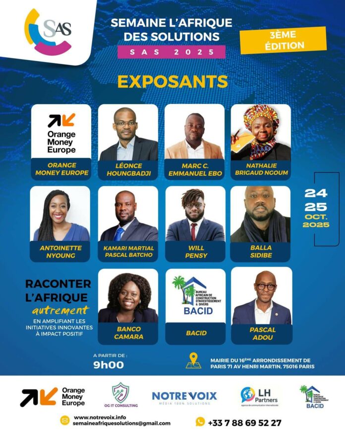 Du 24 au 25 octobre 2025, la Mairie du 16e arrondissement vibrera au rythme de l’innovation, de la créativité et de l’espoir africain à l’occasion de la 3e édition de la Semaine l’Afrique des Solutions (SAS). Placée sous le thème « S’unir pour bâtir l’Afrique des solutions », cette édition promet deux jours intenses d’échanges, d’inspiration et de découvertes, autour d’un journalisme constructif qui raconte une Afrique positive et en mouvement.