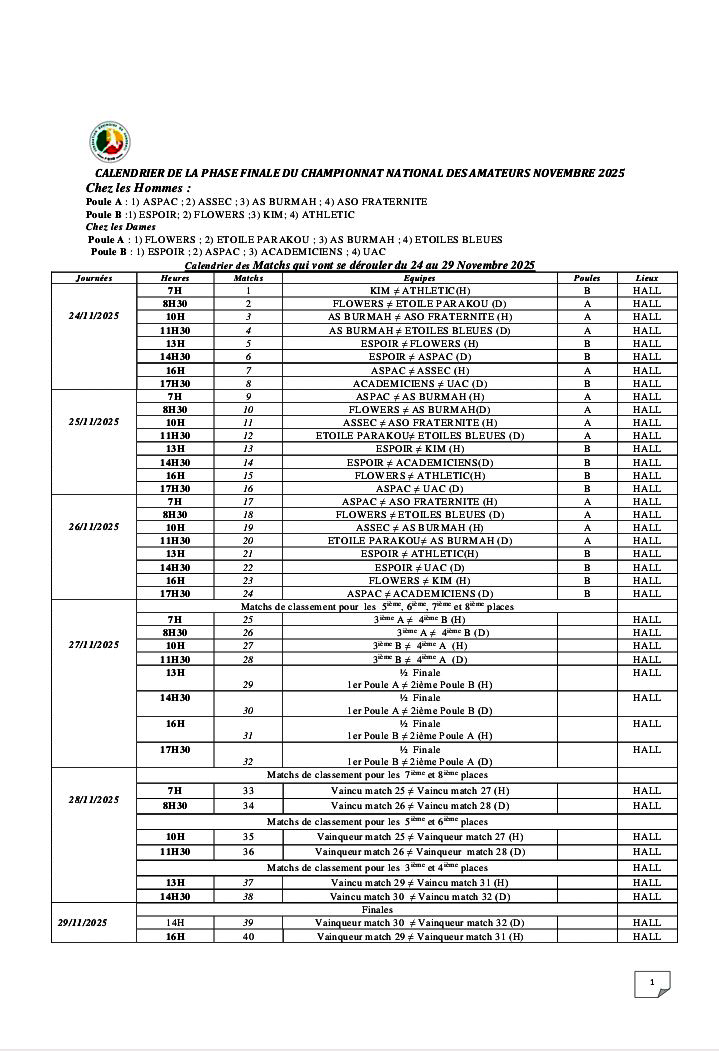 Le Hall des arts, loisirs et sports de Cotonou accueille du 24 au 29 novembre la phase finale du Championnat Amateur Matanti, rendez-vous décisif où s’exprimera la vitalité d’un sport qui gagne en maturité au Bénin. Huit équipes masculines et autant de formations féminines s’y présenteront, portées par l’ambition de hisser haut les couleurs de leurs localités.