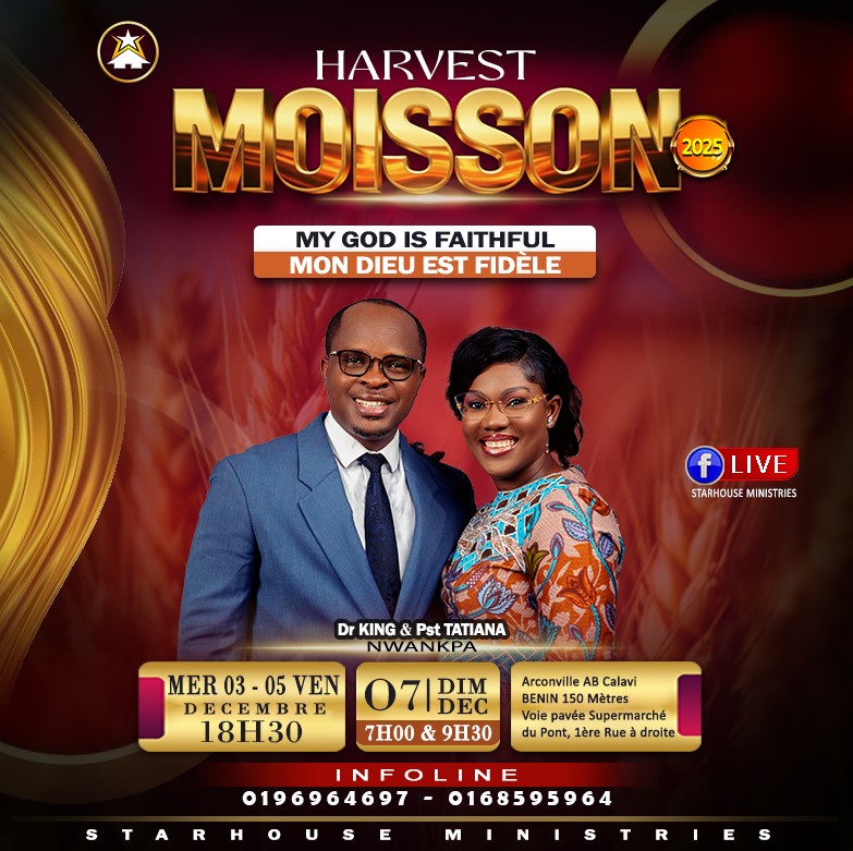 Le peuple de Starhouse Ministries (La Maison des Étoiles – MDE) est en joie et se prépare pour son événement annuel phare : la Fête de la Moisson. Cette célébration tant attendue aura lieu le dimanche 7 décembre 2025, marquant un temps fort d’action de grâce et de reconnaissance envers la fidélité de Dieu.