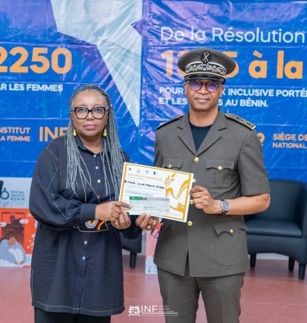 Le préfet du Borgou, Djibril Mama Cissé a été distingué « Champion de la paix ». C’était le jeudi 4 décembre 2025, à l’occasion de la 2ᵉ édition du Salon National des OSC de Jeunes et de Femmes du Bénin, au siège de l’Institut National de la Femme à Cotonou.  Un salon organisé par le Groupe de Travail « Femmes, Jeunes, Paix et Sécurité » (GTFJPS) en Afrique de l’Ouest et au Sahel, section du Bénin en partenariat avec le PNUD, l’Institut National de la Femme, le ministère des Affaires Sociales et de la Microfinance avec le soutien de l’Ambassade de la Belgique.