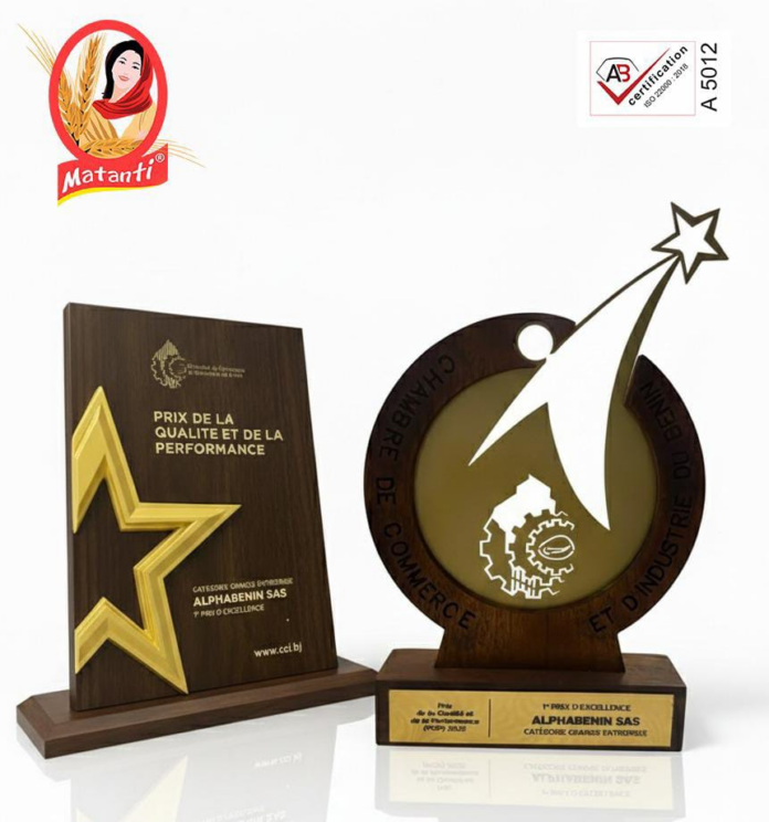 Alpha Bénin SAS s’est illustrée au plus haut niveau lors de la 3ᵉ édition du Prix de la Qualité et de la Performance (PQP), organisée le vendredi 19 décembre 2025 à Cotonou par la Chambre de Commerce et d’Industrie du Bénin (CCI Bénin). L’entreprise, spécialisée dans la production des pâtes alimentaires MATANTI, a remporté le prestigieux Prix d’Excellence, consacrant son engagement constant en faveur de la qualité et de la performance industrielle.