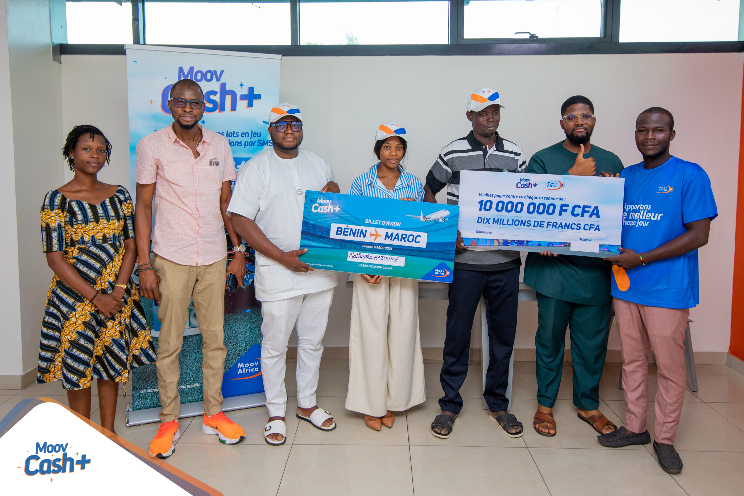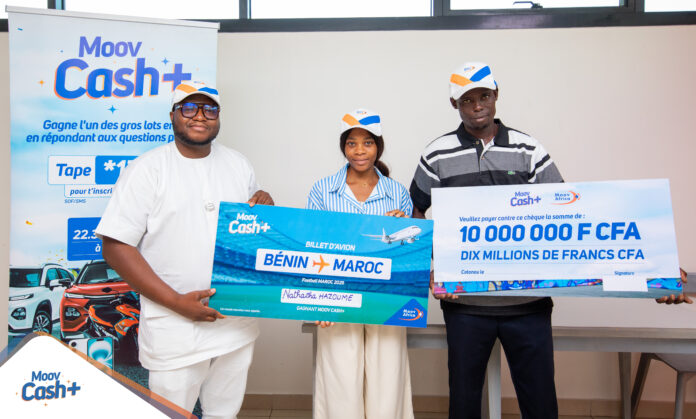 La Direction générale de Moov Africa Bénin à Cotonou a accueilli ce vendredi 19 décembre 2025 la cérémonie de remise des derniers lots du jeu Moov Cash+. À l’issue de cette phase finale, Wahabou GOUNOU a remporté le gros lot de 10 millions de francs CFA, tandis que Marius AHONON et Natacha HAZOUNME ont gagné des billets d’avion pour suivre la CAN au Maroc.
