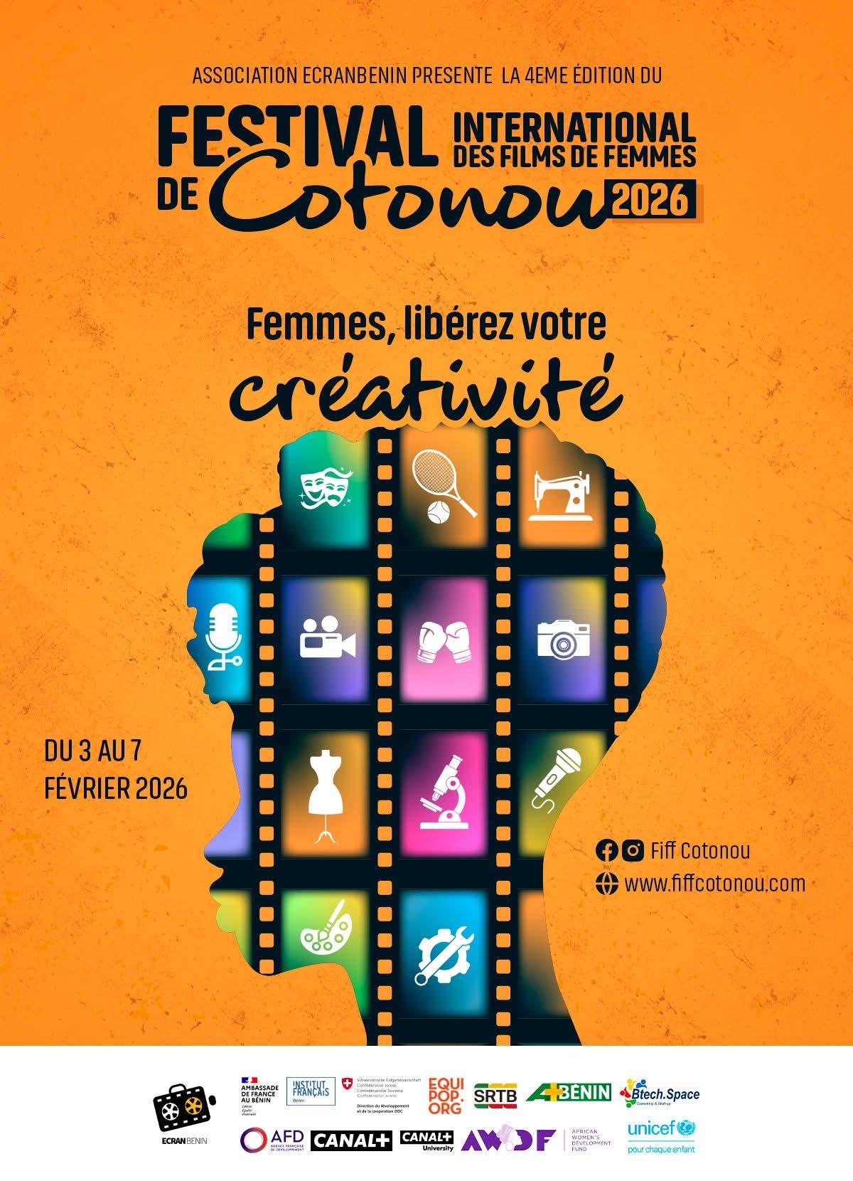 L’Association Écran Bénin dévoile l’affiche officielle de la 4e édition du Festival International des Films de Femmes de Cotonou (FIFF Cotonou). Le festival se tiendra du 3 au 7 février 2026 et sera placé sous le thème évocateur et fédérateur : « Femmes, libérez votre créativité ».Le Symbole de l’Affiche : La Créativité sans Limite, illustre avec force la vocation du FIFF Cotonou à dépasser les frontières du cinéma pour embrasser la richesse du potentiel féminin. La silhouette féminine, traversée par une pellicule de film, est remplie de symboles allant de la caméra au microscope, de la machine à coudre aux gants de boxe. Cette mosaïque visuelle rappelle que :« La créativité féminine est plurielle, vivante et illimitée. Chaque « case » représente une possibilité, une voix, un talent qui mérite d’être vu et reconnu ». Du grand écran à l’innovation scientifique, de la mode à l’expression artistique, le FIFF Cotonou ouvre des espaces essentiels pour raconter des histoires, inspirer et créer autrement.