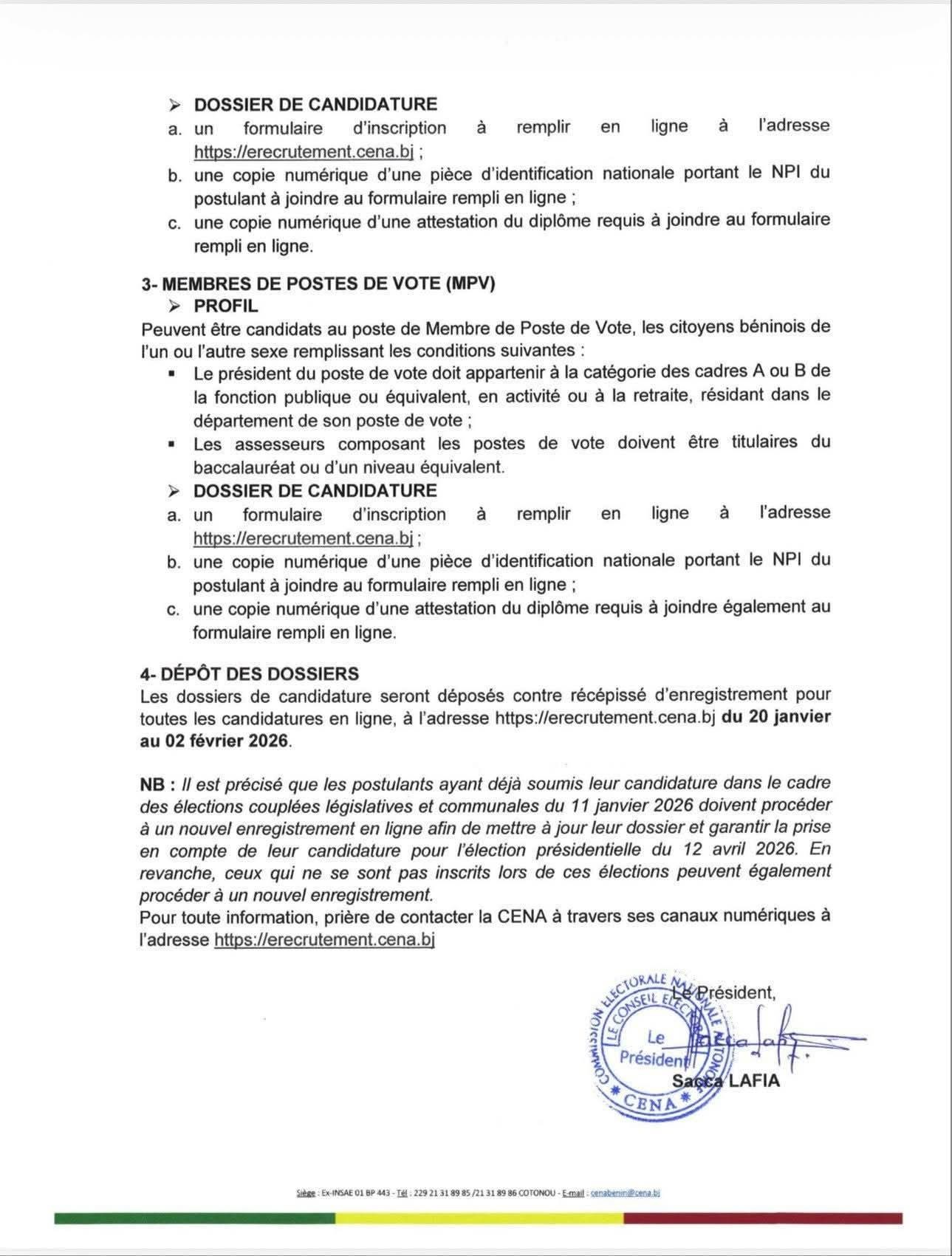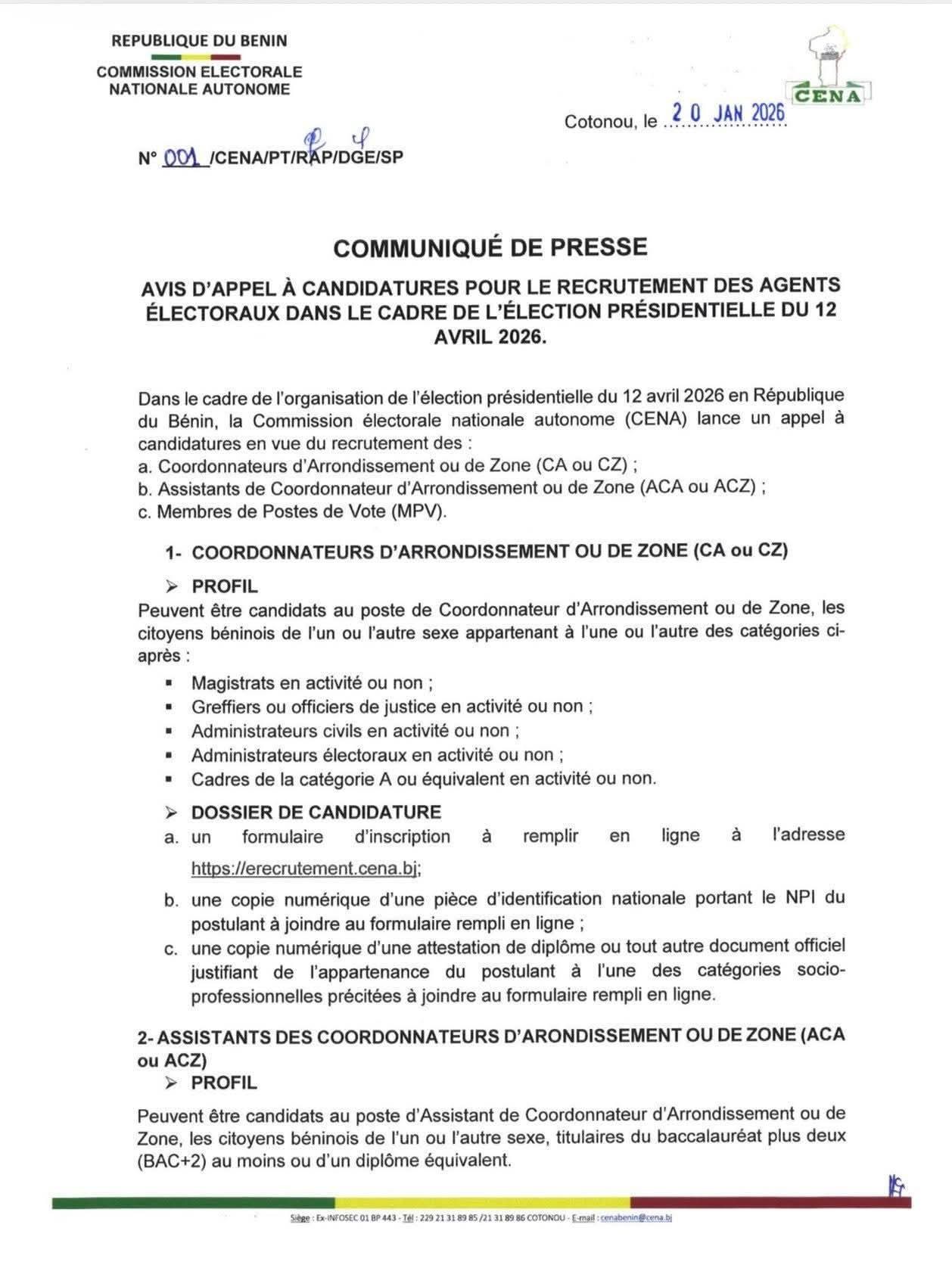 Les postes de Coordonnateurs sont destinés aux cadres de catégorie A (magistrats, administrateurs). Les postes d’Assistants exigent un niveau Bac+2. Pour les Membres de postes de vote, le Baccalauréat est requis pour les Assesseurs, tandis que les Présidents doivent être des agents publics de catégorie A ou B. Le Rendez-vous est donné sur https://erecrutement.cena.bj muni de la pièce d’identité (NPI) et du diplôme. Notez qu’une nouvelle inscription est obligatoire, même pour ceux ayant postulé aux élections de janvier 2026.