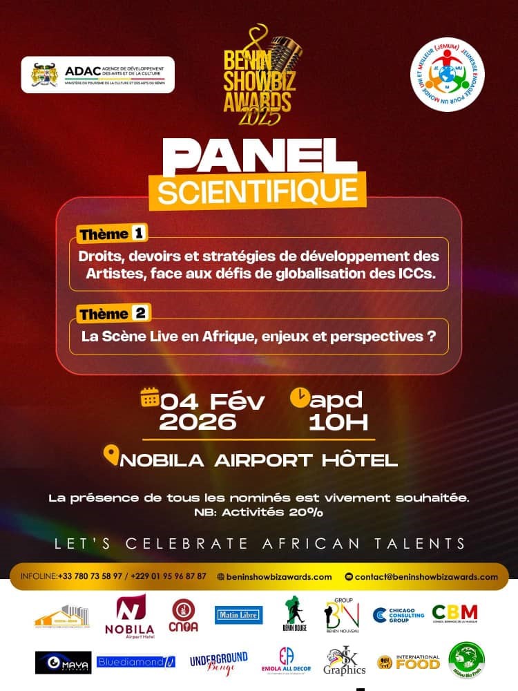Les organisateurs des trophées Bénin Showbiz Awards (BSA) s’activent à tenir le Grand rendez-vous des panel scientifiques. Le 04 février 2026 à Nobila airport Hôtel, les artistes présélectionnés pour l’étape finale de cette prestigieuse distinction sont conviés à se réunir pour prendre part à un riche moment d’échange autour d’une variété de thématiques qui interpelle aujourd’hui la carrière des créateurs d’œuvres de l’esprit. Les échanges sont structurés autour de deux thèmes. Le premier est délibéré comme suit: <<Droit, devoir et stratégie de développement des artistes face au défi de la globalisation des Icc>>. Le deuxième thème qui sera en discutions est relative à << La scène live en Afrique, enjeux et perspectives ?>>. Des thèmes édifiants qui nécessitent la participation assidue de tout le monde.