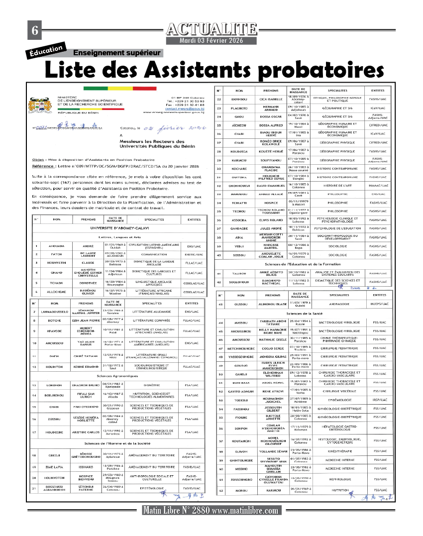 Home Bénin Enseignement supérieur: Liste des Assistants probatoires