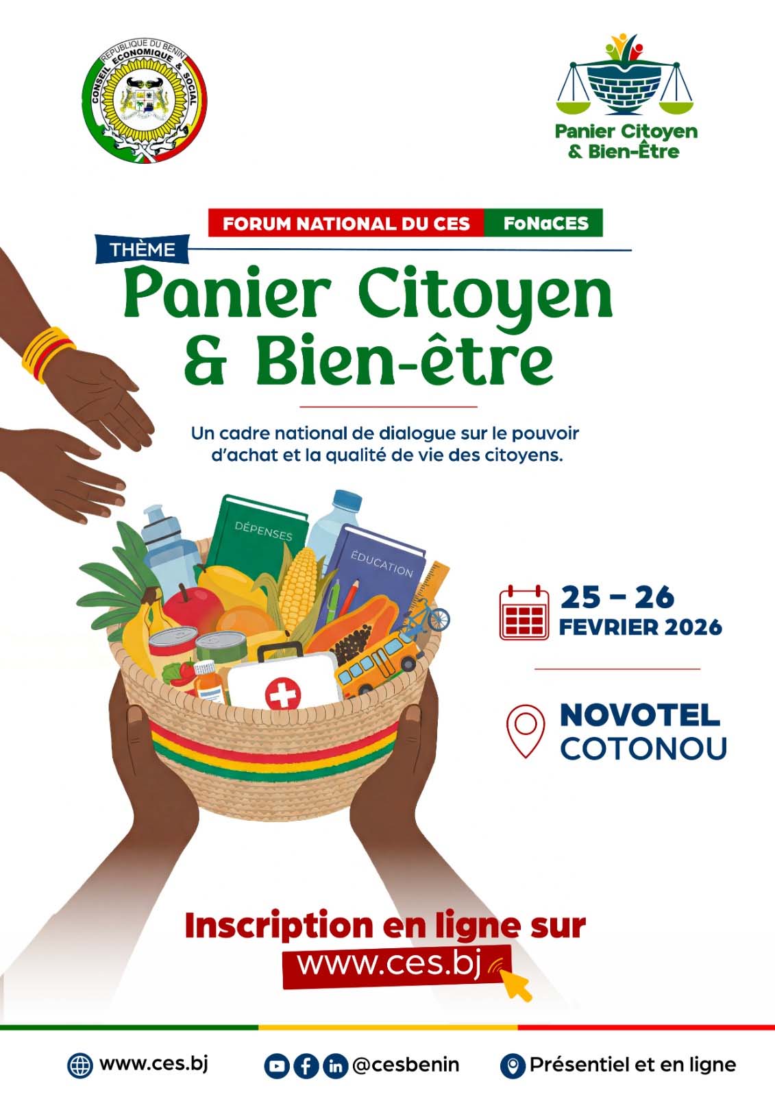 Le Conseil Economique et Social du Bénin organise la première édition du FoNaCES, entendez Forum National du CES, les 25 et 26 février 2026 à Novotel Orisha Hôtel à Cotonou (avec la possibilité de participation en ligne sur inscription). Le thème retenu cette année est : « Panier citoyen et Bien-être ». Il s’agit, d’un cadre stratégique de réflexion et de concertation consacré aux déterminants du bien-être des populations béninoises.