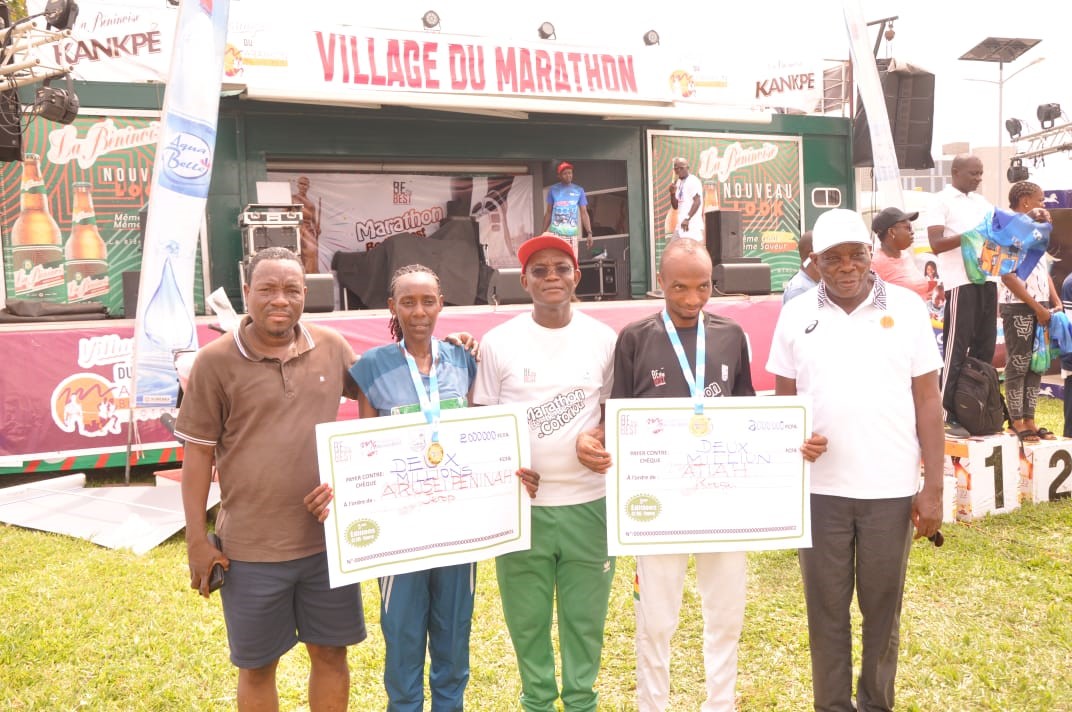 La performance sportive de la cinquième édition du Marathon Be the Best de Cotonou est éblouissante avec les records tombés dans les deux catégories de l’epreuve reine 4242,195 km. Tenu par l’athlète Kenyan Japheth langat (2h27mn28s), le record du marathon Be the Best de Cotonou au 42,195 km, est désormais la propriété du Ghanéen Atiah Koogo de 26 ans qui a couru les 42,195 km en 2h21’54″3. Chez les dames, l’Amazone Bentille Djerikou perd sa couronne au profit de l’athlète kenyanne de 47 ans Arusei Peninah Jerop, championne de la cinquième édition avec un chrono de 2h46’28″6. Notons que plusieurs épreuves ont meublé la cinquième édition du marathon Be the Best de Cotonou. Il y a eu le marathon de 42,195 km réservé pour les élites, le semi-marathon, le 21,100 km. Il y a eu le 10 km en course et le 10 km en marche. Le 5 km en course et le 5 km à la marche y étaient aussi. Enfin, il y a eu le 21 km à la marche. « Je constate que nos athlètes, il en reste un peu plus. Nous allons nous mettre encore plus au travail pour pouvoir nous mettre au niveau des athlètes africains voire mondiaux. » a signifié le Président de la fédération béninoise d’athlétisme, Viérin Dégon sur la performance des athlètes béninois. Notons que les athlètes béninois Ayade Colette et Hounye Jean-Baptiste ont tous fini au pied des podiums (4è) sur l’épreuve du marathon 42,195 km.
