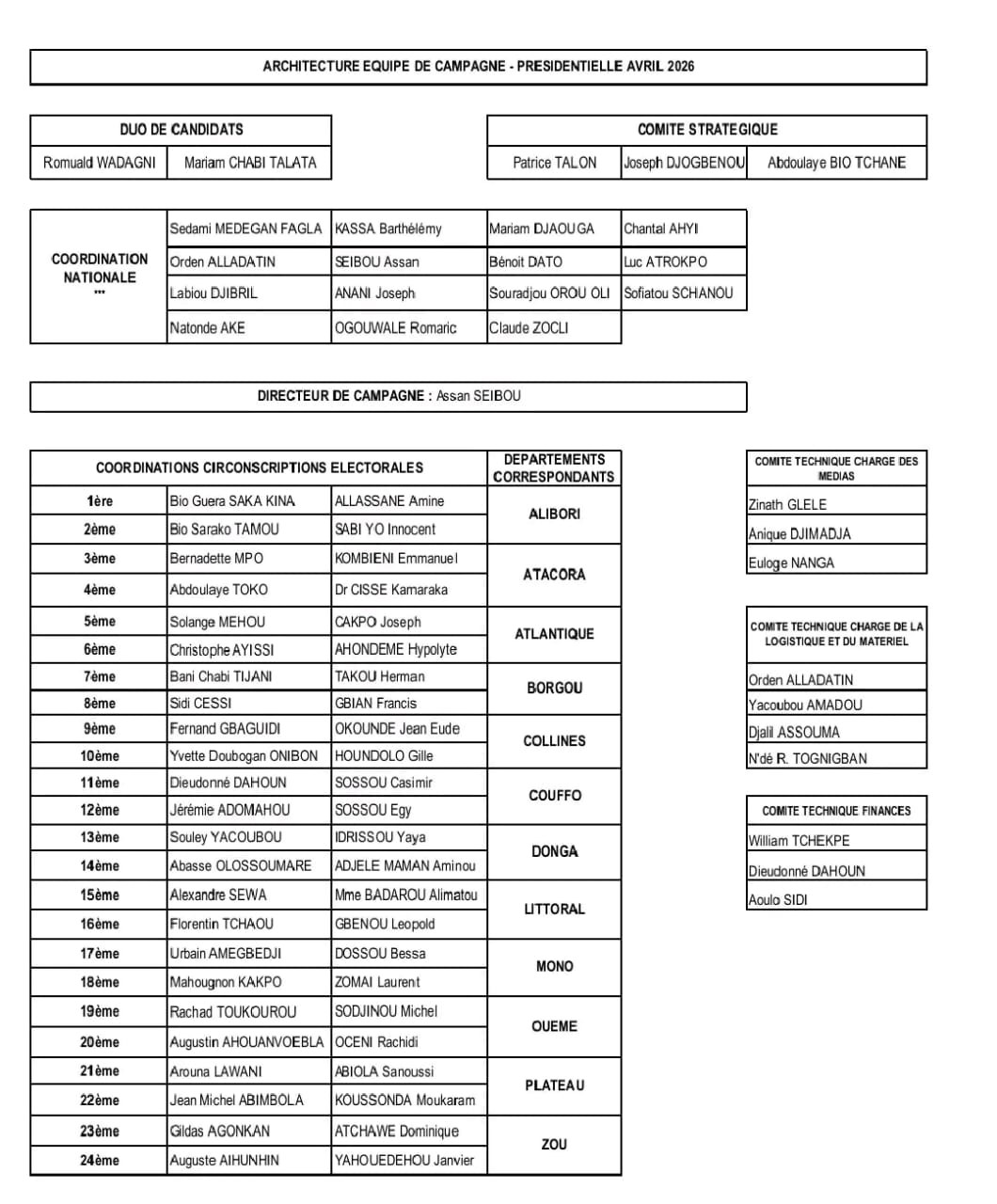 Le candidat de la majorité présidentielle, Romuald Wadagni dispose désormais d’une équipe de campagne. Les members ont été dévoilés hier, mardi 24 février 2026, à la suite d’un conclave au Palais des congrès de Cotonou. Le Comité stratégique comprend le chef de l’Etat sortant, Patrice Talon, le president de l’Assemblée nationale et du parti Up-R, Joseph Djogbénou et le minister d’Etat, president du BR, Abdoulaye Bio Tchané. Assan Séibou occupe le poste de directeur national de campagne. La coordination nationale de campagne est composée, entre autres, de Sèdami Médégan Fagla, Barthélémy Kassa, Orden Alladatin, Benoît Dato, Luc Atrokpo…