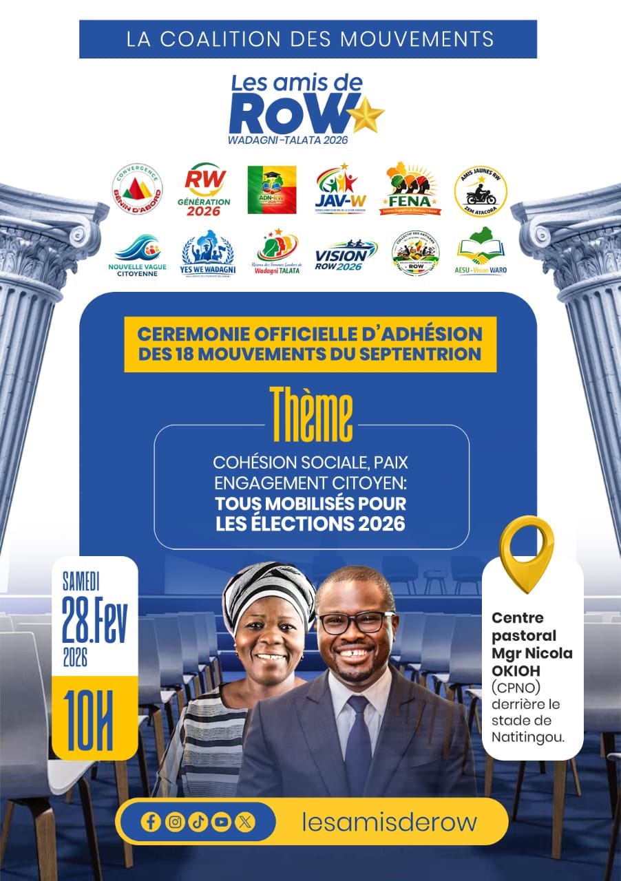Le duo candidats Wadagni et Talata reçoit le soutien  concret d’une multitude de mouvements de jeunesse mais notamment dans la partie méridionale du pays. Et tout annonce déjà les couleurs éclatantes des élections présidentielles de 2026 sur le territoire béninois. Cependant le septentrion n’a pas encore dit son dernier mot. À la coalition existante, 18 mouvements de jeune s’apprêtent à rallier les rangs pour apporter leur pierre à l’édifice de la victoire du duo porté par le camp présidentiel. Sous le thème  »Cohésion sociale, paix et engagement citoyen, tous mobilisés pour les élections présidentielles de 2026 » l’alliance va se sceller le samedi 28 février 2026 au centre pastoral Mgr Nicola Okioh situé derrière le stade de Natitingou. Pour NAIMI Soulemane, responsable de « Les amis de Row » Acteur politique ayant coordonné et dirigé la campagne des élections présidentielles à Cotonou en 2016 pour le compte des (CCC et CCA) pour l’avènement du régime de la Rupture et ancien candidat aux élections législatives de janvier 2023 dans la 16ème Circonscription Électorale,  Président de la Jeunesse TALON JET16, cette cérémonie vise à mobiliser la population de Natitingou spécialement et celles de l’Atacora pour qu’elles plébiscitent le candidat.