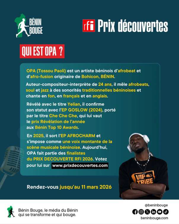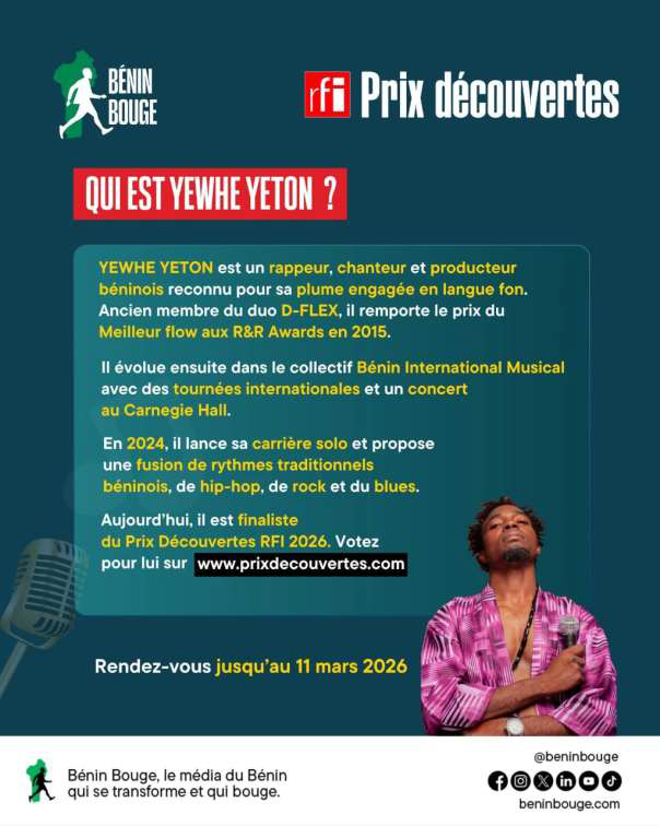 Parmi les finalistes du Prix Découverte RFI 2026, le Bénin à lui seul est représenté par deux jeunes talents de calibre exceptionnel. Il s’agit de Yèhwé Yéton, un rappeur dont la sensibilité retrouve ses racines dans la jonction des rythmes typiquement béninois et Opa l’autre coqueluche de la musique urbaine qui cartonne dans les hits. Le média Bénin Bouge les présente.