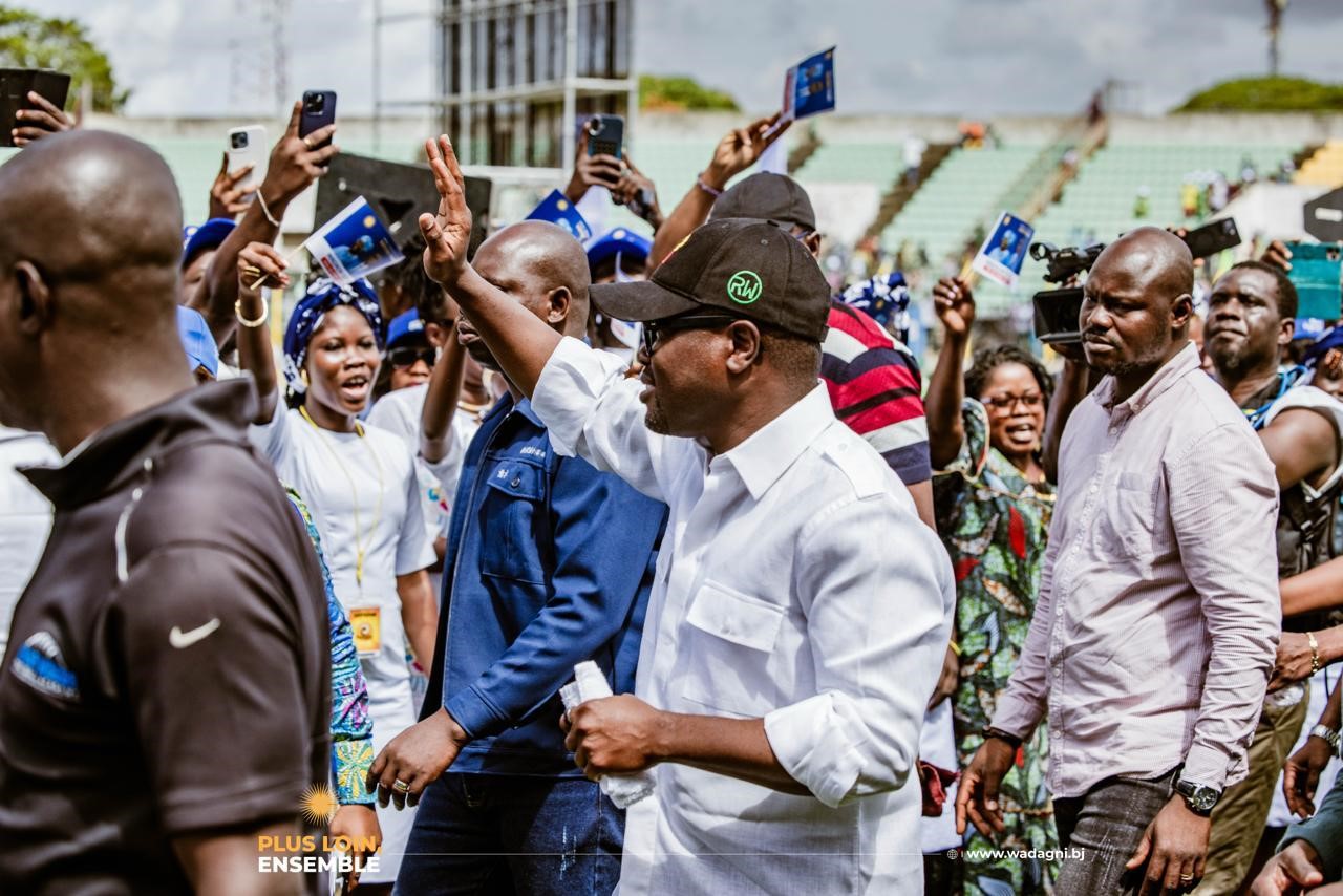 Quand le convoi arrive, l’accueil est spontané. Pas orchestré. Ce n’est pas la chaleur des meetings soigneusement préparés où les applaudissements commencent au signal du responsable de salle. C’est la chaleur bruyante et un peu chaotique des marchés populaires quand quelque chose d’inhabituel se passe. Wadagni descend. Il serre des mains. Il s’arrête sur une commerçante d’âge mûr qui lui parle du marché qui étouffe, des étals qu’on ne trouve plus. Il l’écoute vraiment. On le voit à la manière dont son regard ne se dérobe pas, dont il pose une question, dont il hoche la tête sans que cela ressemble à une technique de communication.