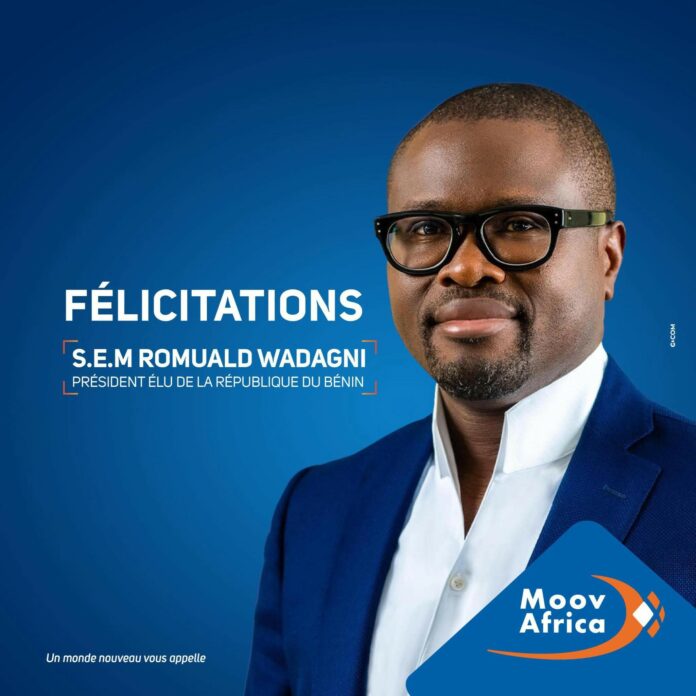Le réseau de téléphonie mobile Moov Africa Bénin adresse ses félicitations au nouveau président élu du Bénin, Romuald Wadagni. Après la confirmation par la Cour constitutionnelle des résultats provisoires de la Céna, Moov Africa Bénin, son Directeur général, les membres du CODIR et tout le personnel adressent leurs félicitations à son Excellence Romuald Wadagni.