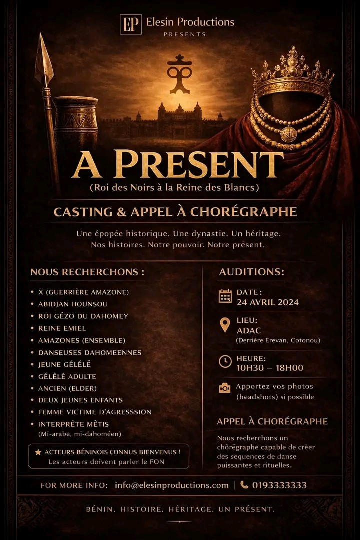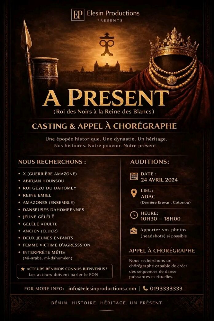Elesin Productions lance un casting dans le cadre du projet A Present (Roi des Noirs à la Reine des Blancs). Ce casting vise à recruter des comédiens, danseuses, danseurs ainsi que des profils spécifiques pour l’interprétation de rôles inspirés de l’histoire et des patrimoines culturels béninois.