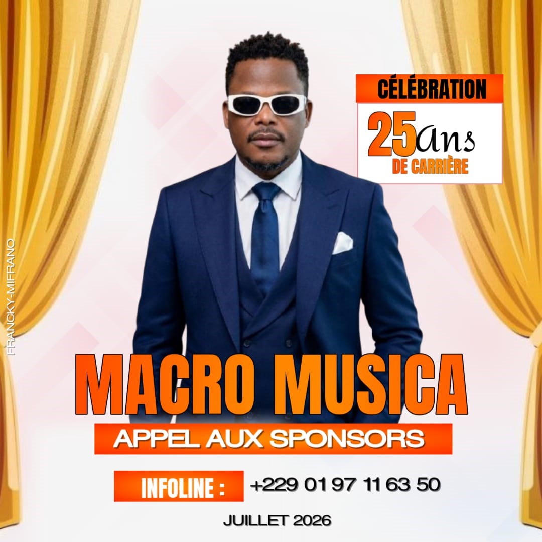 L’artiste »Macro Musica » commémore 25 ans de carrière artistique. Prévue pour être célébré au mois de juillet de l’année 2026, cet événement, aux dires de l’artiste, sera à la taille du nombre d’années d’exercice de son art. Cet événement majeur marquera pour lui un tournant historique dans le paysage artistique du Bénin. Artiste de renom, véritable icône culturelle et ambassadeur de la musique, MACRO MUSICA incarne depuis un quart de siècle la passion, la persévérance et l’excellence artistique. Ce jubilé d’argent sera une occasion unique de célébrer son parcours remarquable, son impact et sa contribution inestimable à l’industrie musicale. À cet effet, un appel solennel aux sponsors, partenaires et mécènes désireux d’associer leur image à cet événement d’envergure, porteur de visibilité, de notoriété et de fortes valeurs culturelles.